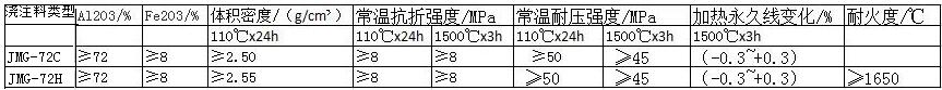 2.2 熱軋高溫加熱爐用鎂鉻質(zhì)耐火澆注料標(biāo)準(zhǔn) 熱軋高溫加熱爐用鎂鉻質(zhì)耐火澆注料牌號(hào)分為 JMG-72C 、JMG-72H。其中J為澆注料第1個(gè)字的漢語(yǔ)拼音首字母,M、G為鎂鉻的漢語(yǔ)拼音首字母:JMG后面的數(shù)字表示產(chǎn)品的MgO含量。數(shù)字后面字母H表示有特定要求的材質(zhì),C表示普通材質(zhì)要求。熱軋高溫加熱爐用鎂鉻質(zhì)耐火澆注料的性能應(yīng)符合表7 表7軋鋼加熱爐用鎂鉻耐火澆注料性能指標(biāo)