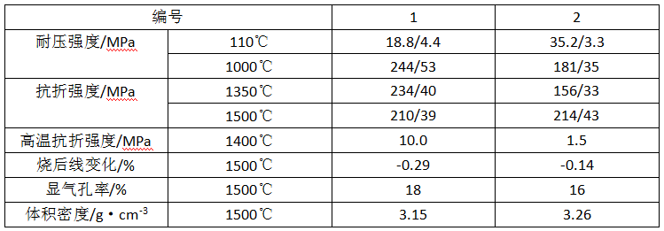 表1-1為硅鋁膠結合剛玉質澆注料的性能。電熔剛玉和骨料的顆粒組成(%);7~2.5mm,26;2.5~1mm,33;1~0.5mm,18和<0.5mm,23。其用量為81.5%;α-Al2O3細粉的細度小于0.076mm,其用量;編號1和編號2分別為6.0%和13.5%。固態硅鋁膠用量則分別為12.5%和5.0%。用水量為4.3%。