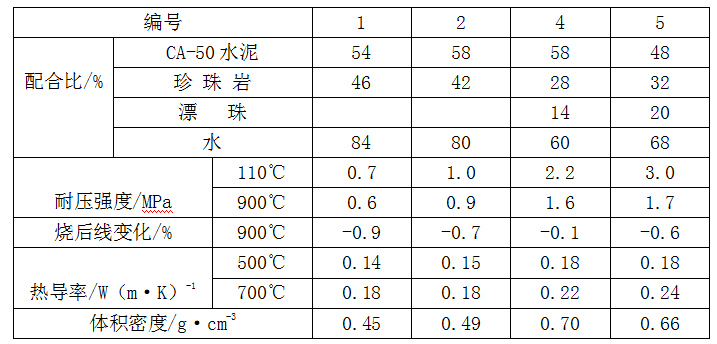 表1-1 珍珠巖澆注料的配合比和性能