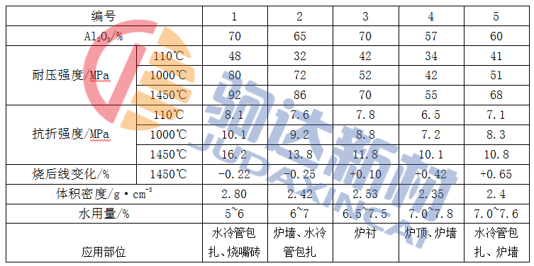 表1-1 加熱爐用自流耐火澆注料的性能