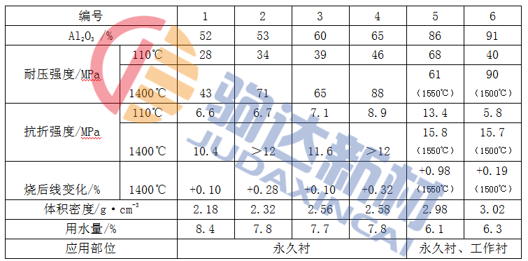 從表1-1可以看出,硅酸鋁質(zhì)、鋁鎂尖晶石質(zhì)和剛玉鎂尖晶石質(zhì)自流耐火澆注料的性能是優(yōu)良的、強度較高,燒后線變化均呈膨脹狀態(tài),有利于使用。另外,編號1和編號2的350℃熱導(dǎo)率約為0.62W(m·K),也有利于保溫隔熱。
