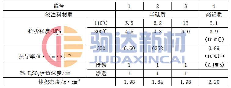 表1-2 半硅質和高鋁質耐酸澆注料的性能