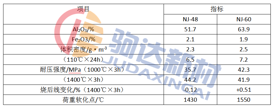 NJ-48主成分是特級煅焦、二級礬土;NJ-60主成分是三級碩土一級礬土。兩個牌號的澆注料都是以優(yōu)質(zhì)藍(lán)晶石為體積穩(wěn)定性,以軟質(zhì)粘土A為結(jié)合劑,以鋁酸鹽水泥為促凝劑,并加入少量添加劑。其粒度組成為10mm~3mm,35%,3mm~1mm 15%,<1mm 20%,<0.1mm 30%。理化性能見表1。