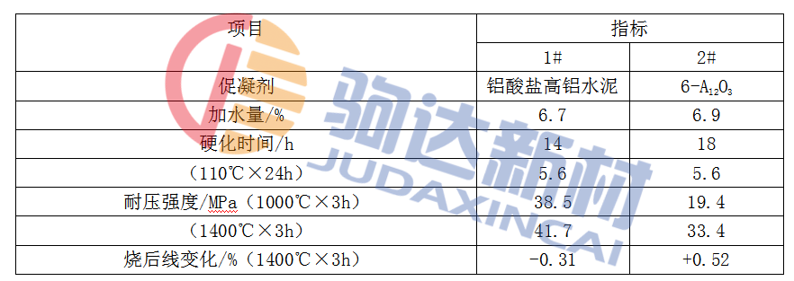 為了進(jìn)一步提高粘土結(jié)合澆注料的使用溫度,作者設(shè)想用σ-Al2O3替代鋁酸鹽水泥做促凝劑,并在實驗室條件下(氣溫20℃)做了對比試驗,試驗結(jié)果如表3所示。