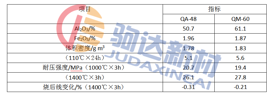 QA-48料,顆粒料采用優(yōu)質(zhì)輕質(zhì)高鋁骨料,粉料為二級礬土細(xì)粉;QM-60料,顆粒料采用輕質(zhì)莫來石骨料,一級礬土細(xì)粉為粉料。結(jié)合劑都是軟質(zhì)粘土A,促凝劑為鋁酸鹽水泥,并加入部分外加劑。表2是兩種粘土結(jié)合輕質(zhì)澆注料的理化性能。
