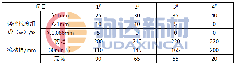 以電熔鎂砂為例研究鎂砂粒度組成對澆注料流動性的影響。保持鎂砂的總量不變,調整鎂砂的粒度組成,分別制作1#~4#四組澆注料(分別加入足量的水分),檢測初始流動值及30min后的流動值衰減,檢測結果見表2。