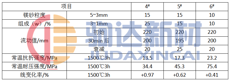 改變鎂砂顆粒的加入量制成4#~6#澆注料試樣,檢測初始流動值和30min后的衰減流動值,以及澆注成型后試樣于1500℃3h熱處理的物理性能。具體添加量及性能的檢測結果見表3。