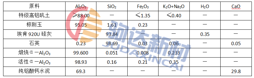 試驗選用的原料主要有特級高鋁礬土顆粒(0~1、1~3、3~5和5~8mm),棕剛玉(0.074mm),純鋁酸鈣水泥,埃肯920U硅灰,煅燒α—Al2O3微粉,活性α—Al2O3微粉,石英粉和廣西白泥,減水劑為三聚磷酸鈉。主要原料的化學(xué)成分列于表1。