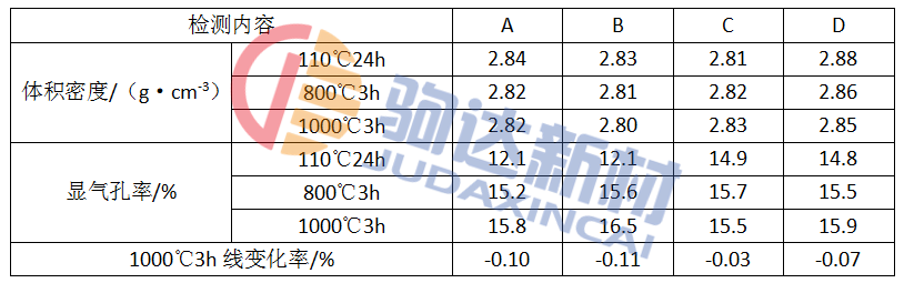 表4 試樣的體積密度、縣氣孔率及線變化結(jié)果