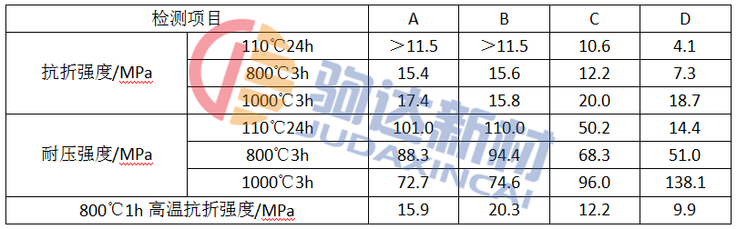 表4結(jié)果表明,A、B、D配方制品的顯氣孔率均隨著熱處理溫度升高而增大,但差距不大;C配方由于添加了廣西白泥,使得體系可以在相對比較低的溫度下出現(xiàn)液相發(fā)生燒結(jié),促使材料致密化,從而提高了體積密度。
