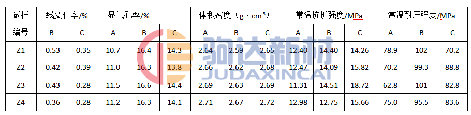 按照相關(guān)國家標(biāo)準(zhǔn)分別檢測試樣的線變化率、顯氣孔率、體積密度、常溫抗折強(qiáng)度和常溫耐壓強(qiáng)度。