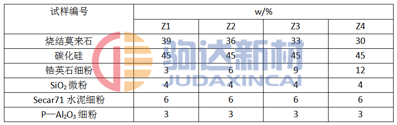 固定骨料和基質(zhì)細(xì)粉的質(zhì)量比為70:30,Z1、Z2、Z3、Z4分別添加鋯英石細(xì)粉(w)3%、6%、9%和12%以替代燒結(jié)莫來石細(xì)粉。試驗(yàn)配方如表2所示。