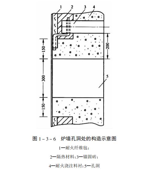 耐火澆注料襯體中的錨固磚布置,必須是直線形的,即橫平豎直布置,以便于振動棒在料中行走。從爐底工作面起,高度方向約為500mm處安裝一排錨固磚,再每隔500~600mm安裝一排,依次類推。最上一排錨固磚與爐頂工作面的最小間距為350~450mm;錨固磚的水平中心間距也是500~600mm;遇有孔洞時,其孔洞工作面與錨固磚最近面的間距,一般應(yīng)大于150mm。同時,孔洞周圍均用耐火澆注料進行澆灌。也就是說,耐火纖維氈和隔熱材料不得直接接觸火焰,其構(gòu)造見圖2。