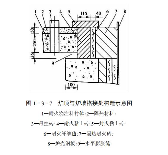 耐火澆注料襯體膨脹縫的留設(shè),可根據(jù)其線膨脹系數(shù)進行計算,然后參照燒后線變化確定。在一般情況下,是根據(jù)這兩個性能指標而憑經(jīng)驗確定的,因為襯體受到的熱應(yīng)力大 小是較難計算的。 爐頂與爐墻搭接處的膨脹縫如圖3所示,根據(jù)爐墻高度和使用溫度等情況,其膨脹縫縫寬在30~70mm之間選定;爐頂和爐墻襯體的膨脹縫留設(shè),與耐火可塑料的基本相 同。不同之處是,在襯體澆灌過程中必須按設(shè)計要求的位置,安放好填縫材料。因為,耐火澆注料施工后有較高的強度,無法切膨脹縫。