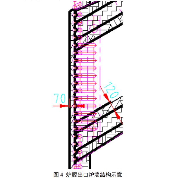 此處工作溫度 800℃~1000℃左右,高溫?zé)煔鈹y帶著床 料粒子從爐膛進(jìn)入旋風(fēng)分離器時,在流經(jīng)出煙口處,氣、固兩相流動速度急劇增大,灰濃度較高,出煙口及其相鄰的后水冷壁周圍區(qū)域受到粒子的沖刷磨損嚴(yán)重,對耐火材料要求有良好的抗磨性能且不易脫落。耐火層材料應(yīng)采用高強(qiáng)度耐磨耐火澆注料如圖 4。