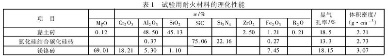 煙塵的主要化學(xué)組成為:SiO2 10.52%CaO 37.27%Fe2O3 29.64%MgO 4.34%AL2O3 2.21%MnO 2.56%TiO20.85%K2O 0.02%Cr2O3 1.13%ZnO 7.05%。可見該煙塵為堿性渣。使用的三種耐火磚的主要理化指標(biāo)見下表