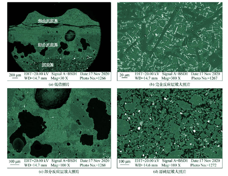 抗渣試驗后的鎂鉻磚試樣可分成附渣層、致密界面層、滲透反應(yīng)層和原磚層四層。根據(jù)各層的放大照片分析認(rèn)為:高溫下液態(tài)煙塵渣能滲透到鎂鉻磚中,但鎂鉻磚中主要成分方鎂石、鎂鉻尖晶石不容易與煙塵渣反應(yīng)生成低熔點物相,因此鎂鉻磚具有優(yōu)異的抗煙塵渣侵蝕性。