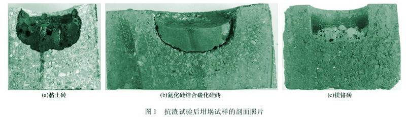 抗渣試驗采用靜態(tài)坩堝試驗方法,在試樣的中間鉆取內(nèi)孔φ36mmX30mm的坩堝試樣,將20g煙塵渣放入坩堝內(nèi)孔中,在1300℃保溫24h后,沿坩堝中心軸切開,觀測其侵蝕情況,試樣的剖面照片見圖1,可以看出:粘土磚侵蝕最為嚴(yán)重,氮化硅結(jié)合碳化硅磚次之,鎂鉻磚幾乎沒有侵蝕