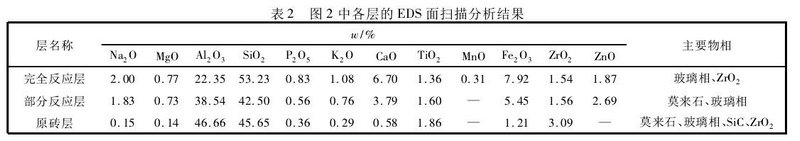 抗渣試驗后粘土磚試樣的SEM照片見圖2,由圖2a可以看出,侵蝕后試樣可分為完全反應(yīng)層、部分反應(yīng)層和原磚層三成。根據(jù)各層的放大照片圖2b)、圖2c)和圖2d)一級各層的EDS面掃描分析結(jié)果(見表2),經(jīng)分析認(rèn)為:高溫下液態(tài)煙塵渣與粘土磚接觸后發(fā)生滲透、侵蝕反應(yīng),粘土磚中的主要成分SiO2AL2O3容易溶解到煙塵渣中。因此粘土磚抗煙塵渣侵蝕性較差。