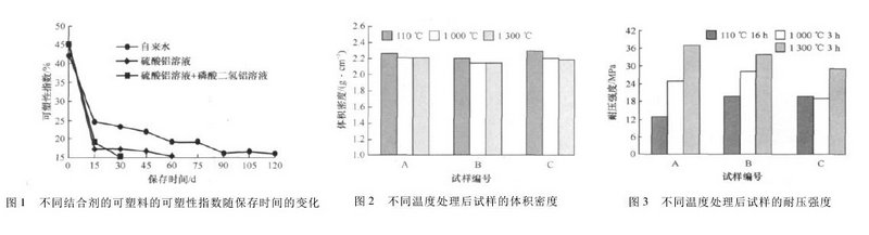 試驗(yàn)采用三種結(jié)合劑分為A/B/C三組,分別以自來(lái)水、硫酸鋁溶液、硫酸鋁溶液+磷酸二氫鋁溶液為結(jié)合劑。將骨料劑粉料加入到輪碾中,混合均勻后加入結(jié)合劑,待達(dá)到要求的可塑性指數(shù)(要求的可塑性指數(shù)哦為40%~45%)后取出,密封保存24h然后搗打成標(biāo)準(zhǔn)試樣進(jìn)行測(cè)試。